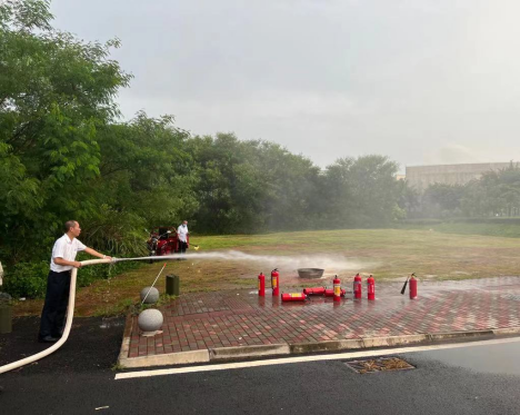 讲座培训结束后,在保卫处消防专业人员指导下,审计处全体人员进行了消防实操演练。王智为大家讲解了灭火器、消防水带的性能,并示范使用方法,审计处全处人员现场操作灭火器、消防水带,进行灭火训练。