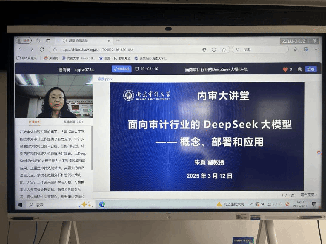 3月12日下午,审计处全体人员在办公楼401会议室观看南京审计大学内部审计大讲堂《面向审计行业的DeepSeek大模型——概念、部署和应用》直播讲座,开展线上学习培训。